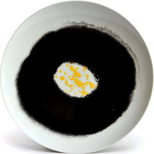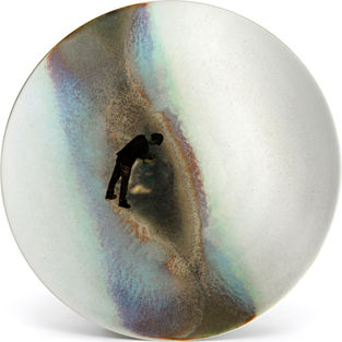 Глазурованный фарфор, бисквитный фарфор, надглазурная роспись, надглазурная платина. D 26.5 см